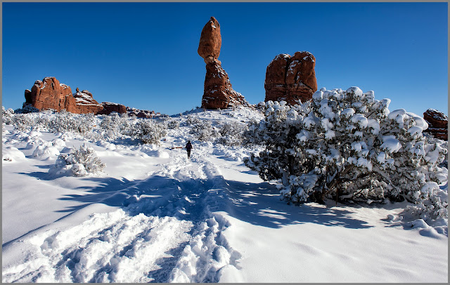 Yesterday Arches National Park (ANP) was covered with 8-12 inches of snow. The park was a winter wonderland. Some trails were a bit icy and slippery—we should have brought crampons. ANP is located in a “high desert” with elevations ranging from 4,085 to 5,653 feet above sea level. ANP contains over 2,000 natural sandstone arches. Throughout the park, rock layers reveal millions of years of deposition, erosion, and other geologic events.